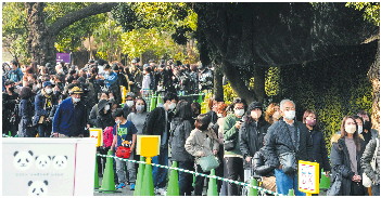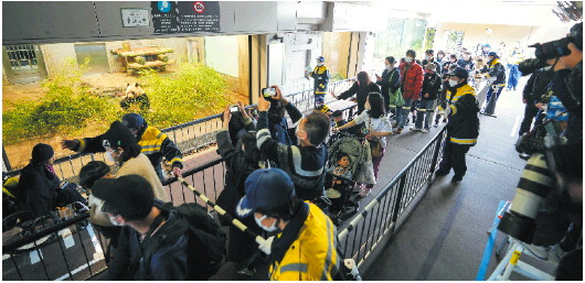 ▼2月19日,在日本东京上野动物园,游客排队与大熊猫“香香”告别。 新华社发