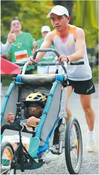 2月19日,罗书坚在深圳马拉松比赛中推着儿子参赛。