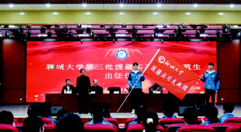 聊城大学校长王昭风为第三批援疆实习支教团指导教师颁发聘书并为支教团授旗。支教团指导教师代表胡朝丽、学生代表李珂欣分别作了表态发言,他们表示,将以饱满的精神状态、精湛的业务技能和扎实的工作作风全力完成好支教任务,努力为西部教育事业发展和民族融合贡献青春力量。