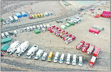 2月23日,救援车辆在新井煤矿坍塌事故现场附近待命(无人机照片)。新华社发
