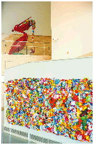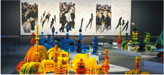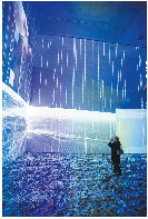 艺术家李洪波用纸媒雕塑创作成《童话世界》,由彩色纸张粘贴、切割后组合成为一个庞大的世界地图装置。经过堆叠排布,借助空间中的镜面反射,最终展现在观者面前的是一片五彩缤纷的童话世界……