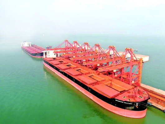 记者从山东港口烟台港获悉,近日,两艘从几内亚起航的30万吨级兄弟船“沙钢意志”和“沙钢信心”轮,航行50多天,经过1万多海里的航程后,在山东港口烟台港西港区矿石码头“相遇”,开启了“兄弟俩”同时在港作业的火热生产景象。