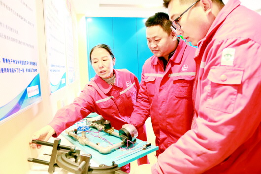 2月20日,在胜利油田鲁明公司济北采油管理区培训工作站,主任技师王秀芳正在给员工讲解轨道式法兰盘错位对中装置的工作原理。今年以来,济北采油管理区持续加强新员工技能培训工作,尤其是更注重理论与实际相结合,将理论教学搬到生产现场,通过更直观的教学方式及时为新员工解疑释惑,将职业技能更好地融汇到理论知识中,提高大家的职业技能、安全意识,便于更快更好地胜任岗位。