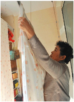 ◥每次买了新的布料,马萍都是拿回家用温水洗干净了再用来制作被褥,她家阳台上挂满了布料。