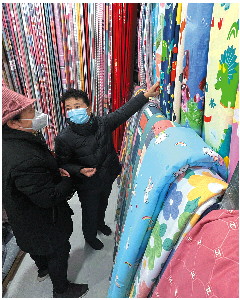 马萍和志愿者正在纺织批发市场购买布料。