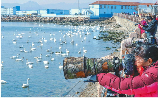 初春回暖,荣成天鹅湖上波光粼粼,在这里度过了整个冬天的大天鹅即将陆续返乡,向遥远的西伯利亚、贝加尔湖等地回迁。它们不停地练习起飞降落,为即将开始的长途跋涉做准备,优美的姿态,吸引游客和摄影爱好者不停按下快门,定格美丽瞬间。 记者 王震 田佳玉 潘佳蓬 摄影报道