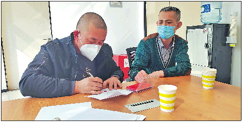 芝罘区人社局组织各方进行调解,老宋(左一)在自己梳理的工资单上签字。 记者 钟建军 摄