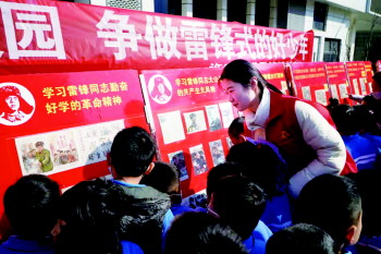 活动现场,展现雷锋学习工作和生活的展板一字排开,再现了雷锋平凡而伟大的一生。在志愿者和学校老师的引导下,学生们排成整齐的队伍有序参观。“雷锋的原名叫什么,有知道的请举手?”“雷锋经常帮助身边的人,体现了他的什么品格?”……在每一块展板前,志愿者都会生动讲解照片背后的故事,并提出问题跟同学们互动。同学们认真仔细地看着面前的老照片,每个人脸上都写满了对雷锋的敬畏。