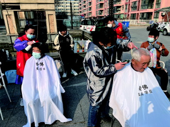 哈佛美发学校的学生加入志愿者行列,在社区内免费为老年人理发。