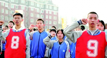 “一鼓作气,直冲云霄!今天看我挥洒血汗!六月看我金榜题名!”学生们举起右手大声宣誓,铿锵有力的誓言响彻校园。