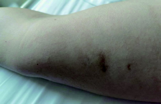 其症状为青筋发黑、变硬、产生条形或硬结改变等,严重者会出现药物外渗,导致皮肤或肌肉组织溃烂坏死。这样不但增加了治疗费用,而且更增加了患者的痛苦。臂式输液港(右图),作为先进的输液工具,治疗更安全、患者更舒适。因臂式输液港的导管入路在上臂的大血管,经超声引导穿刺,其尖端位于上腔静脉下1/3可避免血管因刺激而导致的硬化、坏死等。而臂式输液港因其切口小,不需要缝合固定,安全可靠、输液方便,越来越受到患者的认可,临床应用越来越广泛。