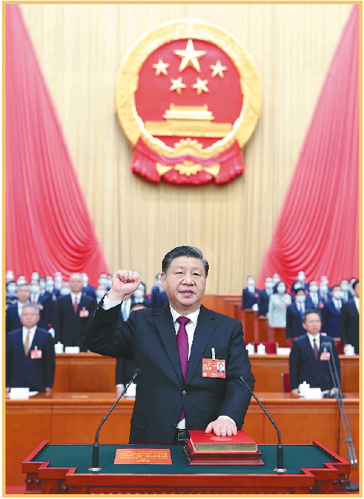3月10日,十四届全国人大一次会议在北京人民大会堂举行第三次全体会议。习近平全票当选中华人民共和国主席、中华人民共和国中央军事委员会主席。这是习近平进行宪法宣誓。 新华社发