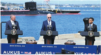 本报讯 当地时间3月13日,美国总统拜登在加州圣迭戈美国海军基地与澳大利亚总理阿尔巴尼斯以及英国首相苏纳克举行会面,就所谓“三边安全伙伴关系”举行会谈,并公布了为澳大利亚配备核潜艇的计划。