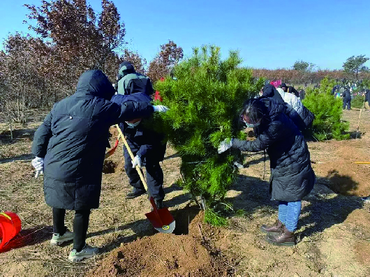 ◤图为植树节当天文登区纪委监委工作人员到文登营镇侯家庵村参加义务植树活动。