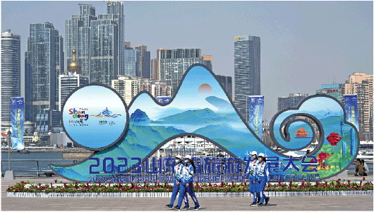 3月26日,2023山东省旅游发展大会在青岛开幕。大会以“相约时尚青岛,共享好客山东”为主题,集中展示山东文化旅游业取得的新成果,旨在激发文旅市场活力,培育产业发展动能,提升“好客山东 好品山东”品牌影响力,向世界展现山东新形象。这是在青岛奥林匹克帆船中心,几名大会志愿者从主题展板前经过。 新华社发