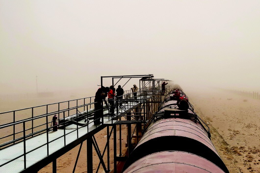 24日上午8时许,风沙渐起,停靠妥当的销油列车像一条沙尘中隐蔽的长龙,不见头尾。销油站台上,工作人员挂牢安全带做好个人防护,在蒙方海关监管人员一系列规定检查后,装油工作迅速展开。经过六个小时的连续奋战,销油装车工作于当天下午2时顺利完成,这期间大家没能喝上一口水,连午饭也没顾上吃。人员撤离时,能见度已不足50米。