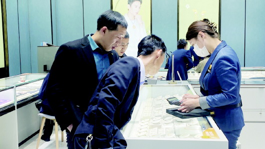 3月25日傍晚,记者来到枣庄市市中区解放路的“金店一条街”,发现每家珠宝店都将自己店内最新款的金饰摆放在了进门显眼的位置,供消费者选择。已是傍晚,但进入店内挑选、咨询黄金的消费者依旧不在少数。