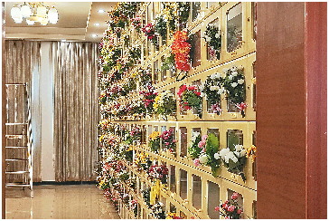 清明到来之际,骨灰寄存部里满是鲜花。