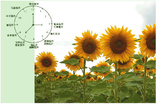 在我国,蛇麻花凌晨约3点首先开花,大约4点,牵牛花的大喇叭也跟着张开了;然后野蔷薇花开(大约5点),龙葵花开放(大约6点);接下去是美丽幽雅的郁金香(大约7点30分)和半枝莲(约10点)、大爪草(约11点)盛开,午时花(约12点)迎着烈日怒放。正午过后,万寿菊花开(约15点)、紫茉莉(约17点)添香,烟草花(约18点)绽开。夜晚降临,月光花(约19点)吐蕊,待宵草(约20点)破蕾。