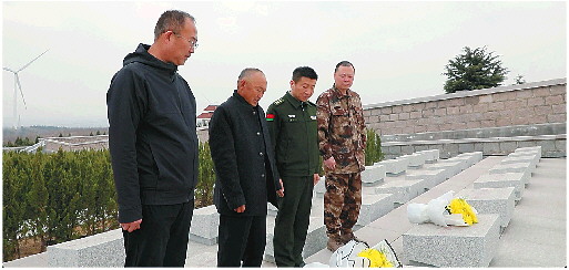 清明节前夕,于和民老人(左二)来到烈士陵园看望他守护了23年的两位烈士。 栖霞融媒供图