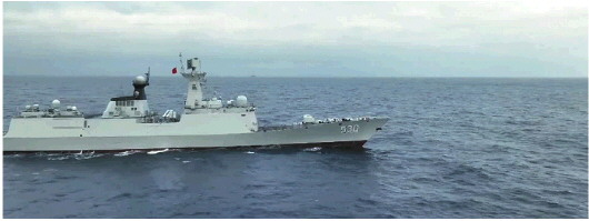 4月9日上午,东部战区海军徐州舰在台岛以东海域实施战术动作,在目视距离大约5海里处是台湾地区的宜阳舰。