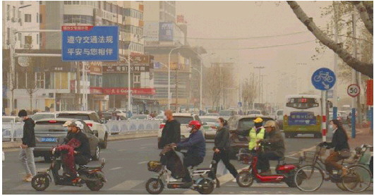 受沙尘天气影响,11日的烟台市区街头,天地一片昏黄,不少行人戴着口罩在路上匆匆走过。 记者 吕奇 摄