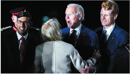 ◥当地时间11日,美国总统拜登抵达英国北爱尔兰首府贝尔法斯特,英国首相苏纳克(左)前去迎接。 IC photo
