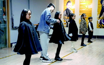 记者看到,小朋友们整齐地站成一排,随着亓老师不同背景音乐的播放,他们会严格有序地进行不同动作的训练,所有人都面对着一面巨大的镜子,以助于他们能随时调整自己的动作与表情。