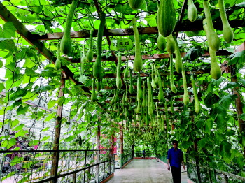 走进七号“无土栽培模式展示馆”,形形色色的蔬菜无土栽培种植模式让人目不暇接,满眼的绿色蔬菜在那里“花样”生长,充分展现了现代科技与农业生产的完美结合。走进展馆,记者发现,廊架上垂吊的龙凤瓜错落有致,不同造型的管道设施密密匝匝,无土栽培这一前沿科技的魅力在此一览无余。展馆中央,东西向、南北向的两条纵深“绿色长廊”是该馆的“明星展区”,形状不同、大小不一、颜色各异的辣椒果实累累、缀满枝头,将“长廊”点缀的分外好看。为增强观赏效果,今年七号馆对“绿色长廊”进行了重新布局。