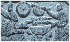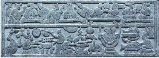 如果说出土的各种炉具只能反映出烧烤设备的状况,而刻在砖石上的图像则再现了两千多年前古人烧烤的真实场景。从地域分布来看,山东、河南、江苏、四川、陕西、甘肃等地的画像石刻中都曾出现烧烤的画面。汉晋画像砖石上生动形象的“烤串”“食串”场面,展示了一幅生动的古代风情画卷。