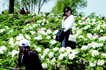虽然是工作日,却还是不时遇到前来观光的游客,其中不乏“全家总动员”。他们或停下来赏花,或边走边欣赏美丽的湖岸光景。从车上望去,牡丹和芍药漫无边际,一眼望不到头,花香浓郁,暖风熏得游人醉。