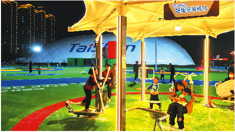 4月18日,记者在乐陵市泰山智慧公园看到,一个大型的白色气泡造型的球馆即将落成,球馆前还有泰山体育的智慧体育器材,人造草坪明亮的色彩很是吸睛,上面还有一些可以做活动和游戏的图案设计。“踩上去更能感受科技的神秘。”一位在草坪上运动的小伙告诉记者。