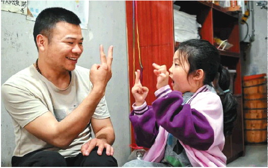 妞妞不仅在修脚店里给客人翻译,平时的生活中,她也是爸爸的贴身“翻译官”,胡勇出去剪头发也带着女儿,用手语告诉女儿自己想剪的样子,女儿领会了他的意思,他会露出欣喜的笑容,一边比画一边点头。妞妞得到了爸爸的肯定再转述给理发师,“我爸爸说头发要剪帅一点,把它剪得平一点就行了。”