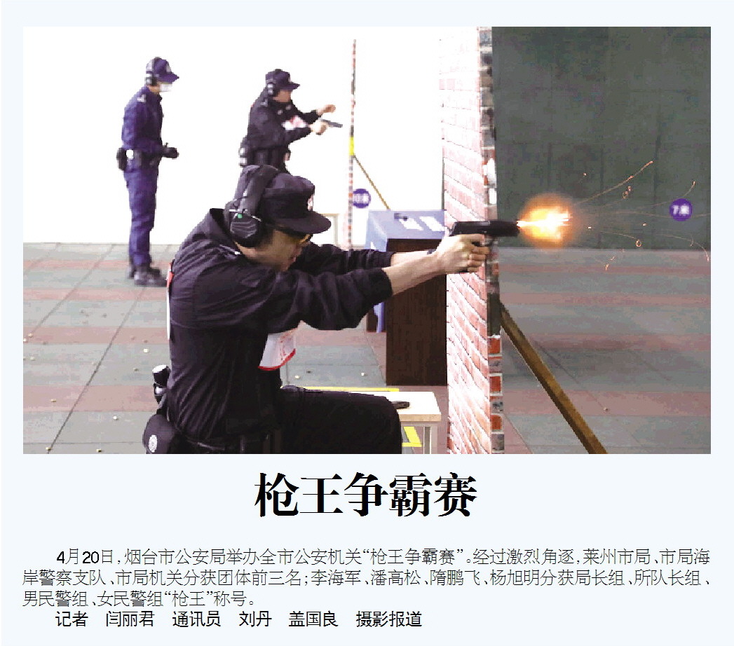 4月20日,烟台市公安局举办全市公安机关“枪王争霸赛”。经过激烈角逐,莱州市局、市局海岸警察支队、市局机关分获团体前三名;李海军、潘高松、隋鹏飞、杨旭明分获局长组、所队长组、男民警组、女民警组“枪王”称号。