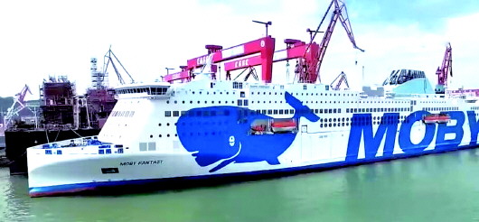 客滚船是一种具备交通和运输双重功能的船舶,下层主要用于装运车辆,上部空间为游客提供住宿和娱乐服务。“MOBY FANTASY”号共有13层甲板,533间客房,满载可容纳2500名乘客。船上配备4层车库,可装载各类车辆800余辆。该客滚船配备有极低功耗的发动机系统和液化天然气接口,不仅能在极低燃料消耗的情况下实现最快25海里/小时的高速航行,还可以根据需要将液化天然气作为动力燃料,进一步降低船舶污染物的排放。该船是全球这类船型中,首先获得EEDI(能效设计指数)三阶段节能环保指标的客滚船。