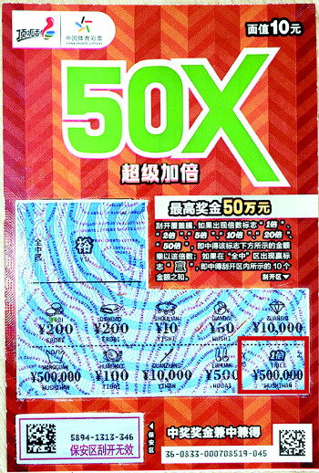 “我当天去机选了5注大乐透,站点的销售员还向我推荐了这款顶呱刮新票。于是我就选了10张面值10元的票,刚刮到第2张,我看着票面上的‘1倍’字样,知道自己中奖了,但是看到后面那么多零,我就纳闷了,赶紧拿给站长看,人家一看不得了,原来这是一等奖整整50万,真的是没想到。”王先生说道。 (郑钦泽)