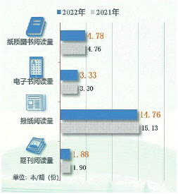 从成年国民对各类出版物阅读量的考察看,2022年我国成年国民人均纸质图书阅读量为4.78本,高于2021年的4.76本。人均电子书阅读量为3.33本,高于2021年的3.30本。