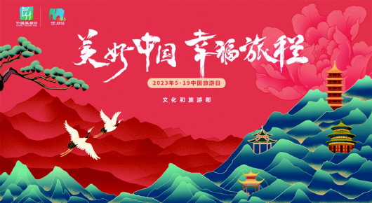 日前,文化和旅游部发布的2023年“5·19中国旅游日”宣传推广主视觉,以“中国红”为主色调,集合了牡丹、青松、白鹤、亭台楼阁等中国传统元素,整体画面呈现为:千里江山,牡丹花开,青松白鹤,山川绵延,寓意国家繁荣昌盛,富贵祥和,人民幸福安康,与自然和谐共处。主视觉风格大气,展现中式美学,旨在以华夏大地的山河锦绣、人文璀璨,深刻表达中国人民对生活的美好期待和中华民族的美好未来。