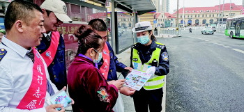 23日,青岛交警市南火车站中队“金盾”志愿、公交集团隧道第八分公司“暖行-心益”团队、崂山巴士第三分公司“我等您”团队的志愿者们在铁路青岛站周边的兰山路公交车站开展“知危险会避险,安全文明出行”交通安全公益宣传活动。向游客讲解了如何在公交车站防范“鬼探头”类事故,倡导游客要严格遵守交通安全法规,做到安全出行,文明出行。