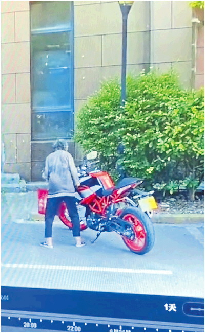 小陈和物业人员查看了监控:有个老人颤颤巍巍靠近摩托车,用胳膊和身体抵住车把,用力推倒摩托车,随后扬长而去。