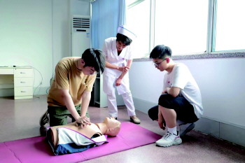 潍坊市人民医院社工部和急诊部为学生进行应急救护培训。
