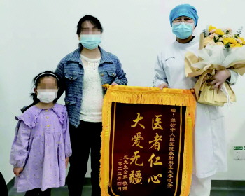 被救治的女童及家长来到潍坊市人民医院院放射科,给李晓芳护士送上了锦旗和鲜花。锦旗上印着“医者仁心,大爱无疆”几个沉甸甸的大字,真切地表达了孩子及家长对救命恩人李晓芳护士的感激之情。李晓芳看到孩子恢复得不错,内心感到非常欣慰。