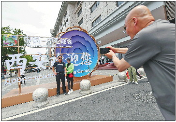 5月16日,游客在西安市北大街上与中国-中亚峰会主题装置合影。 新华社发