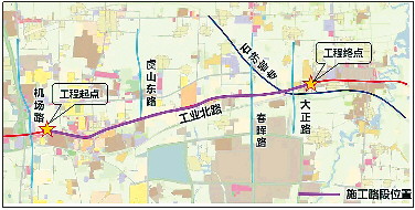 工业北路快速路东延在起点处通过郭店立交桥接上现有的高架,向东延伸,一路穿过多条南北向道路,到达龙山立交附近后,高速大东环线、铁路货运北环线与工业北路主路相交,由于新建高架的高度受限,高速、铁路的高架桥“阻挡”了工业北路向东延伸的步伐。因此,在上跨高速、铁路方案不可行的情况下,工业北路快速路东延在附近“下坡”,建设部分地面快速路,从下方穿过大东环、大北环。