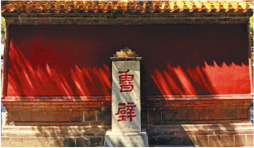 公元前221年,秦统一六国,建立了中央集权国家——秦朝。秦王嬴政认为自己“德兼三皇,功过五帝”,采用其中二字构成“皇帝”称号,自称秦始皇。秦始皇独尊法术,罢黜百家,因此焚毁典籍、坑杀儒生。儒学大家、典籍藏家孔子后人为了保护藏书,就在孔庙内孔宅故井旁新建了一堵黄瓦脊顶红墙,高3米、长15米,外形如同迎壁。墙根正中矗立一块石碑,镌刻两个红色隶体大字——鲁壁。“壁”字原本是上下结构,这里却写成左右结构,“土”字写到左下边,而且还多写了一个“点”,令人颇感奇怪。