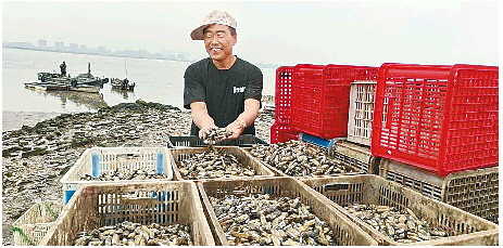 时至5月中下旬,青岛市即墨区田横镇丁字湾海域的万亩滩涂上迎来蛏子收获季。潮水退去,在裸露的滩涂上,渔民穿着水衣拿着铁锨,将生长在滩涂下30多厘米深的蛏子一个个挖出来装进篓筐。当潮水上涨,渔民也结束一天的劳作,一筐筐鲜美肥硕的蛏子被抬上岸,称重后直接装车运到市场。收获期一直持续到秋季,每天上万斤个大肥美的蛏子源源不断进入周边海鲜市场,丰富市民餐桌。