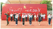 伴随着《红旗颂》,山东建筑大学国旗护卫队、志愿者队代表高举党旗、团旗、队旗,随后三面旗帜在现场684名少先队员中缓缓传递。