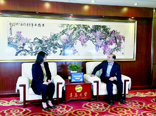 青岛大学副校长孔伟金(右)接受采访。