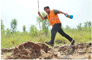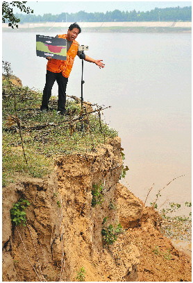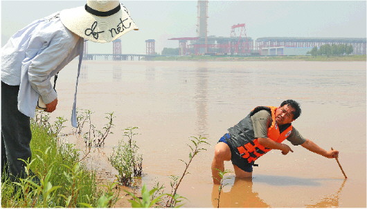 ◥王和新以身试险,用三米长的枯树枝向游客展示黄河的凶险。