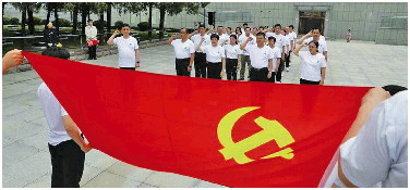在孟良崮战役纪念碑前,面对鲜红的党旗和烈士雕像,全体党员重温入党誓词。